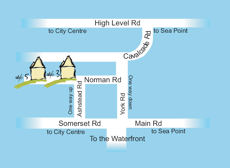 From N1/ N2/ airport follow signs to Cape Town/Waterfront/Sea Point. At the third set of lights turn right into Sommerset road. Follow road approx. 1,2km. At Mario´s Restaurant turn left (Ashstead Road). First left again into Norman Road. Reception is 5 Norman Road.